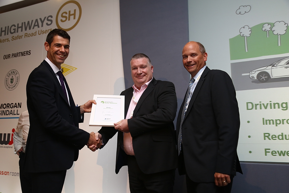 Mark Byard, Health Safety and Wellbeing Director at Highways England presents the Driving for Better Business Champion certificate, signed by Chief Executive Jim O’Sullivan, to Joe Docherty, Head of HSEQ and Rob Allen, Business Director, from Amey.
