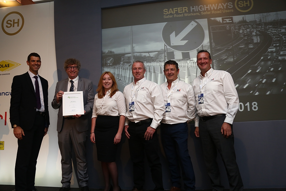 Mark Byard, Health Safety and Wellbeing Director at Highways England presents the Driving for Better Business Champion certificate, signed by Chief Executive Jim O’Sullivan, to the team from WJ Group who put their company’s case study together including Paul Aldridge (Group Sustainability Director) Georgia Cope (Group Commercial Assistant), Alan Brookes (Group Training Academy Manager) Scott Logan (Group Transport Manager) and Craig Williams (Health and Safety Director)