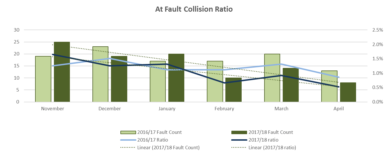 A key performance Indicator for this metric is the collision frequency rate. This is calculated as the percentage of drivers in the fleet that are involved in a collision in a month. The graphs below highlight the downward trend for both all accident frequency as well as own fault collision frequency across the same period in consecutive years.