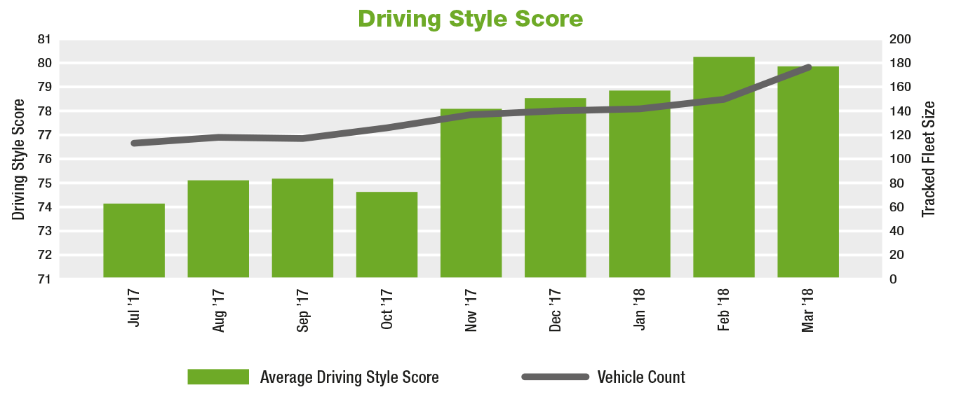 The score is calculated based on the number of relative speeding, harsh braking, and acceleration events, as well as time spent idling and time and distance driven. The graph below shows an improving trend.