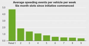 The results from the driver behaviour telematics have been equally impressive. Graph 2 shows the reduction in speeding violations where a vehicle was being driven at more than 5mph above the posted speed limit. Now there is an average of just one speeding incident per three vehicles per week.