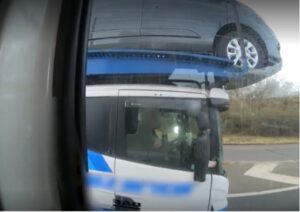 Driver caught steering huge car transporter with just his elbow by police in unmarked National Highways HGV cab